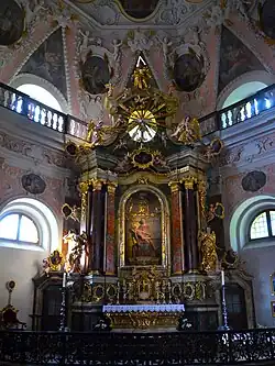 The church is equipped with several Baroque gilded altars. The monument of the church is a 7.5m high painting of "Decapitation of St. James", which decorates the main altar. Its author, one of the painters of Empress Maria Theresa, J. N. Steiner, was born in Jihlava. In church are kept sculpture treasures - a unique pieta from 1330, the statue of St. Catherine of Alexandria from the beginning of the 15th century and the late Gothic statue of St. James from the 16th century. An interesting artefact is the modern replica of the Přemyslid cross. The original is dated to 1330 and is now located in the picture gallery of the Strahov Monastery. The replica is there to remind, that the original was hung in the church of Jihlava.