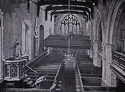 In 1724 work began to change the church roof from tiles to lead, work that was completed in 1758; until this point the church had a three-span roof but this work saw the roof assuming the one-span structure that is maintained to the current day.[22] In 1742 the plain window on the northern wall behind the pulpit was replaced "with a Square Crown Glass in order to give it better light, and also to alter the Sounding Board in such a manner as shall be thought most proper upon the opinion of the Revd. Mr. Smith, Vicar, and the workman."[22] According to Couper, the housekeeping records during this century became "more meticulous than ever"; records were kept of the monies received for each member of the congregation ("1/- for each person 'seated' in the Church or Churchyard, and 3/4 for a child's")[23] as well as for items such as "a pound of soft soap" (7d), "oyle" (3d) and "a chamber pott" (9d).[23]