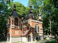 The cemetery church in Lublin was built in the Russian Revival style.[3] It is a tripartite structure. The entrance to the building is through a rectangular church porch, above which rises a bell tower topped with a tent-like roof, crowned by a small onion-shaped dome. The church nave is built on a square plan, with a similar tented roof and onion-shaped dome above it. Four similar constructions are located at the corners of the nave, standing on cylindrical tholobates. The chancel is situated in a semi-circular apse.[3]