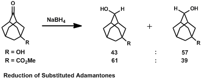A similar example is seen in substituted 2-adamantones, where varying the electronic properties at the remote 5 position has profound effects on product distribution.[10] A hydroxyl group is able to donate electron density inductively to the forming σ*C–H bond antiperiplanar, so attack from that side is favored. The electron-withdrawing ester substituent, however, lacks this stabilization ability. Instead, the C–H bonds are better electron donors than the C–CO2Me bonds, so attack comes anti to the hydrogen substituents and subsequently syn to the ester group. This explains the effect of remote electron-donor groups on stereochemical outcomes, which has been difficult to explain with other stereochemical models. The rigidity of the adamantone skeleton allows for tight control of conformation and minimization of competing effects.[11]