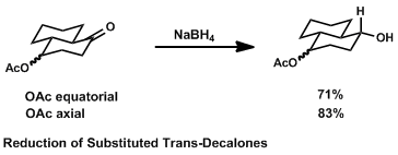 Similarly, in Houk's trans-decalone system, the nucleophile with its partial negative charge prefers to attack away from the partial negative charge of the acyl ester. When this substituent is axial, the equatorial pathway brings the nucleophile into closer proximity and is therefore disfavored.[23] This is less pronounced for equatorially substituted ester because the group is now positioned further away from the carbonyl.[17]