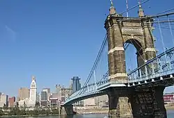 Being situated on the Ohio River, Cincinnati is home to several prominent bridges that connect the downtown to Covington, Kentucky and Newport, Kentucky. In fact, there are more bridges that cross the Ohio River in Cincinnati than at any other place on the River. These bridges include the historic and picturesque John A. Roebling Suspension Bridge, which served as a prototype for the Brooklyn Bridge; the Daniel Carter Beard Bridge (aka The Big Mac Bridge); and the Newport Southbank Bridge (sometimes referred to as the Purple People Bridge), which is the longest pedestrian-only bridge in the United States connecting two states.
