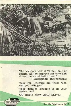The Vietnam war is "a hell hole of racism for the Negroes GIs over and above the usual hell of war," a quote from The Philadelphia Independent on an anti-war poster