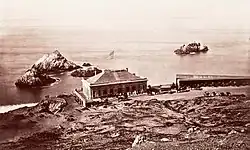 Anecdotal stories claim that in 1858 Samuel Brannan paid $1,500 for lumber salvaged from a ship that foundered on the rocky shore's basalt cliffs near Seal Rocks[5] and built the first Cliff House. While Brannan may have constructed a building there, no historical evidence of this building exists and its role in the origin of the Cliff House remains apocryphal.[6] The Cliff House was built by Senator John Buckley and C. C. Butler, opened in 1863 and leased to Captain Junius G. Foster.[7][8][9] It was a long trek on foot from the city and the restaurant hosted mostly horseback riders, small-game hunters or picnickers on day outings. With the opening of the privately built Point Lobos toll road a year later, the Cliff House became a Sunday destination among the carriage trade. Later the builders of the toll road constructed a two-mile speedway adjacent to it where well-to-do San Franciscans raced their horses along the way. On weekends, there was little room at the Cliff House hitching racks for tethering the horses for the thousands of rigs. Soon, omnibus, railways and streetcar lines made it to near Lone Mountain where passengers transferred to stagecoach lines to the beach. The growth of Golden Gate Park attracted beach travelers, in search of meals and a look at the sea lions sunning themselves on Seal Rocks just off the cliffs, to visit the area. In 1877, the toll road, now Geary Street, was purchased by the city for approximately $25,000.