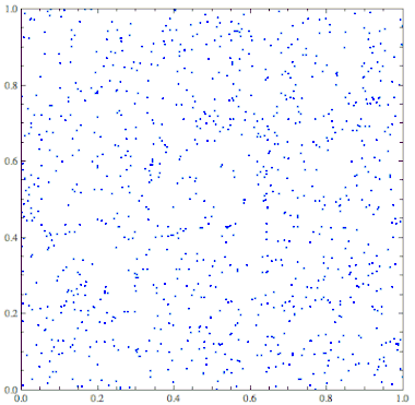1,000 points randomly distributed inside a square, showing apparent clusters and empty spaces
