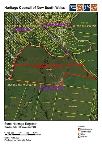 - St.Phillip's Church (AD01) - On the eastern side of Richmond Road, most likely in the vicinity of the cemetery on the original alignment of the road. French (1988) places it on the eastern banks of South Creek. There are no easily discernable above-ground signs of the church's existence so this site is a potentially significant archaeological site.[1]