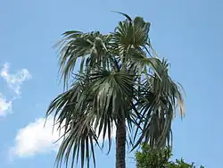It is a small (2–6 m tall), slow-growing fan palm with leaves that are dark blue-green above and silver-coloured below.[5] Measurements in Fairchild Tropical Garden showed an average growth rate of 12 centimetres (4.7 in) per year.[6] Flowers are white and small on light orange branches. The fruits are globose and half an inch in diameter. They are initially green and turn purple or black when ripe.