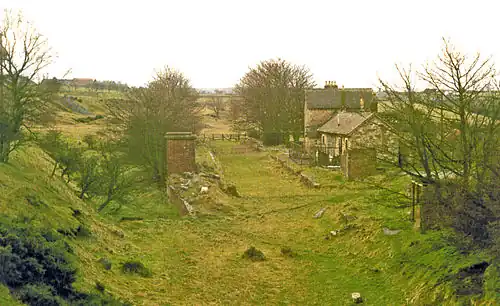 The station was opened as Cockfield on 1 August 1863 by the North Eastern Railway on the route the SD&LUR, one of its predecessors. The suffix Fell was later added to the station's name on 1 July 1923[1] to avoid confusion with another London and North Eastern Railway station in Suffolk of the same name.[2] It closed to passengers on 15 September 1958 and to goods traffic on 18 June 1962.[3]