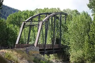 The Cold Springs Bridge was constructed in 1884 at the Snake River Crossing in Ontario, Oregon. In 1917, the bridge was disassembled and relocated to Blaine County, Idaho. It crosses the Big Wood River 2 miles south of Ketchum, Idaho. This bridge served the Union Pacific from 1936 to 1981 bringing skiers on luxury trains to Sun Valley, Idaho. In 1984, the Blaine County recreation district converted the bridge to pedestrian use.