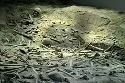 A mass grave is a grave containing multiple human corpses, which may or may not be identified prior to burial. The United Nations has defined a criminal mass grave as a burial site containing three or more victims of execution,[1] although an exact definition is not unanimously agreed upon.[2][3][4] Mass graves are usually created after many people die or are killed, and there is a desire to bury the corpses quickly for sanitation concerns. Although mass graves can be used during major conflicts such as war and crime, in modern times they may be used after a famine, epidemic, or natural disaster. In disasters, mass graves are used for infection and disease control. In such cases, there is often a breakdown of the social infrastructure that would enable proper identification and disposal of individual bodies.[5]