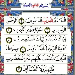 Surah Fatihah is said to be an epitome of the Holy Quran and is called the Mother of the Book. "In it are comprehended, within a brief compass, all the verities and wisdom of the Holy Quran". The Sura has seven verses, including the 'Bismillah'. The complete Sura is: