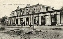 Station building with a military horse-drawn ambulance of the 6e Corps and a guard house, 1916. Preserved unter the ownership and management of Le Conseil Départemental de la Meuse. |