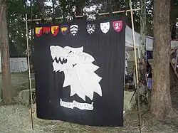 When the Company of the Wolf deploys as a group, the Wolf banner is displayed. This is a large black banner displaying the arms of the Company. When static, this banner remains in the campsite signifying the Company is present and deployed as a unit. On parade or for combat displays, the banner can be carried by two bearers to announce that members of the Company have taken the field. When a member of the Company of the Wolf achieves the rank of knight, the armorial achievement of the member may be added to the banner in miniature. Children of knights, even when not knights themselves, are permitted to display their arms alongside their parents' with appropriate marks of cadency. As accessibility and inclusiveness are key components of the group's mission, children of members have always been encouraged to participate. When an existing member, male or female, becomes the parent of a new child, the baby is bestowed honorary membership until the age of 14, when they may decide for themselves if they wish to continue participation with the Company.