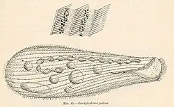 Condylostoma are very large elongated unicellular ciliates with lengths ranging from 176 to 1600 μm.[4][5] They also tend to be about 7 times longer than their width.[4][6] While the shape of the cell can vary depending on many factors, especially the amount and size of food vacuoles present, they are normally more rounded towards the middle of the cell and have a blunt posterior end. The relatively small buccal groove is about 13 the size of total body length and is present ventrally on the anterior part of the cell. The buccal groove is triangular. While there are no cilia inside the groove the surrounding "lips" are covered in cilia. Early papers describe a thin transparent undulating membrane around the buccal groove which is now known to be the adoral zone of membranes (AZM). These membranes can be composed of 70 to 200 polykinetids.[7] They have a very elastic thin pellicula (membrane) surrounding the cell which can be 2 to 8 μm depending on the section. The cells are covered in longitudinal myonemes, which help make them contractile, and have trichocysts present in the posterior end of the cells. Being ciliates they are covered in cilia except in the buccal funnel.[4] The cilia are oriented following the myonemes in rows. While the number of kinetosomes do not change during interphase, the length of the kineties do, to accommodate for the cell's change in size.[7] Their cilia are long and slender, with the posterior cilia being the longest. Additionally, some research states that the ventral side of the cell has fewer, longer cilia than the dorsal end but this has been disputed.[1][4] Additionally many species were found to have at least one frontal cirrus with some having up to four present.[8] Looking at the interior of the cell, they are full of food vacuoles as well as cortical granules. They have a macronucleus with differing numbers of nodules ranging from 6 to 120.[1][4] The pellicle of the cells is rough and dark grey, with randomly dispersed granules directly below it. The cell itself is almost colorless but has a slightly grey or yellow tinge to it.[3] No contractile vacuole was observed at least in the marine species. The cells in this genus are notoriously hard to identify for two main reasons. First, there are many morphological differences between the species in this genus making it hard to identify them as belonging to the Condylostoma genus. Second, the species that have been described do not have as much detail as would be needed given the fact that there are few character states, otherwise known as traits, that can be used to identify cells as belonging to this genus.[4]