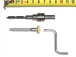 A specialized stepped drill bit and a screw to match it. The screw is covered with a cosmetic plastic cap. The Z-shaped object is an allen key.