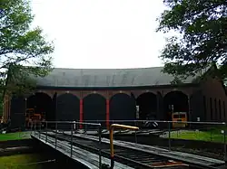 The roundhouse is now home to some of the museum's historic collection of trains. A replacement 60-foot, manually operated turntable was purchased from Edaville Railroad in 1994, moved to the site, and installed by museum volunteers.[7]