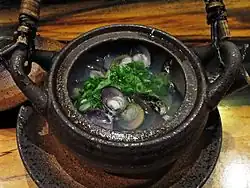 In Japan, the clam is usually called shijimi, though this technically refers to the Corbicula genus in general. The more precise name is yamato-shijimi ("Japanese corbicula"). Shijimi and asari, (Lajonkairia lajonkairii) are two of the most common clams used in soups and tsukudani (simmered seafood).[3]