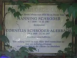 During the final year of World War II trying to seek refuge from the bombing of Berlin, Schröder-Auerbach moved with her daughter Nele to the village of Dargun, Mecklenburg. Under veiled so-called Aryan identity she restarted public music performances in the village of Dargun, working as church organist, choirmaster and music teacher.[3]: 212 From the beginning of 1944 to March 1945, the Schröders hid the Jewish couple Werner and Ilse Rewald, who had gone into hiding, in their home in Berlin-Zehlendorf, saving them from certain death. In 1978, Hanning Schröder was recognized for this by Yad Vashem as Righteous Among the Nations.[6][7]