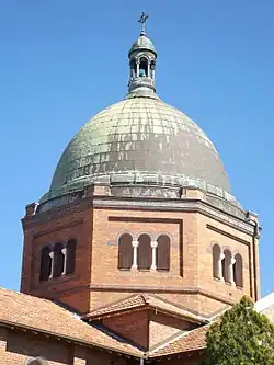 Corpus Christi Church is a symmetrically composed, polychrome brick building, with traditional Latin Cross plan and a polygonal chancel extending from the western end. The terracotta tiled roof, is gabled over the front and two transept entrances and hipped over the chancel. The dominant feature of the church is the copper sheeted dome, which extends about 100 feet (30 m) above ground level above the junction of the transepts and nave. Surmounted on the dome is an octagonal lantern, with a Celtic cross finial. The dome rests on an octagonal drum, supported square planned arcade. The drum, of polychrome brick, features tripartite arched window openings on each of the eight faces.[1]
