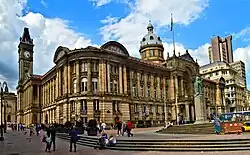 Birmingham City Council House in Birmingham, England, is the home of Birmingham City Council, and thus the seat of local government for the city. It provides office accommodation for both employed council officers, including the Chief Executive, and elected council members, plus the council chamber, Lord Mayor's Suite, committee rooms and a large and ornate banqueting suite, complete with minstrel's gallery. The first-floor's exterior balcony is used by visiting dignitaries and victorious sports teams, to address crowds assembled below. The Council House, which has its own postcode, B1 1BB, is located in Victoria Square in the city centre and is a Grade II* listed building.[1]