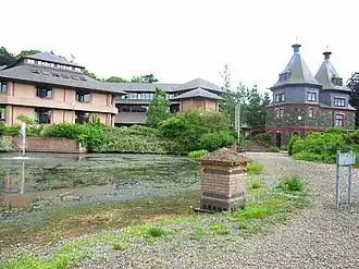 The works began with the demolition of the Pump House Hotel: the former pump house itself, where the mineral spring had been used for the treatment of patients, was retained.[7] The new building, which was designed in the Postmodern style as a series of connected pavilions, was officially opened on 27 November 1990.[8]