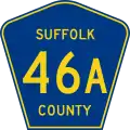 CR 46A was the original designation for the alignment along the west side of Brookhaven National Laboratory between Yaphank-Moriches Road and south of the interchange with NY 25. It was eventually integrated into CR 46 while the old CR 46 (Upton Road) was abandoned to both the lab and private developers. The interchange with the Long Island Expressway was built at the geographic center of Long Island. Few people know for certain which part of it is the center, but some believe it is located on the northeast quadrant of the interchange. The cloverleaf intersection features collector-distributor roads on the Long Island Expressway, an upgrade from the typical cloverleaf interchange that was originally designed for the site.[6] Far off the northwest corner of this interchange is the site of the former Suffolk Meadows horse racing track, which today stands as the site of a housing development project.