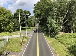 Immediately after this interchange, the road crosses the Metedeconk River (South Branch) into Lakewood and turns north, coming to the intersection of Ocean Avenue (Route 88). At this point, CR 549 becomes two-lane undivided Lanes Mill Road and enters forested areas with some homes, turning northeast as it comes to the intersection of Lanes Mill Road (CR 526). Immediately after, the route crosses the Metedeconk River (North Branch) back into Brick and passes more residential and business areas, heading west of a park and ride lot, before intersecting with Burnt Tavern Road (CR 63). At this intersection, CR 549 turns east onto Burnt Tavern Road and has an interchange with the Garden State Parkway again, this time providing full access. After the parkway, CR 549 turns north onto Lanes Mill Road while CR 632 continuing east on Burnt Tavern Road. The Brick Park and Ride serving NJ Transit buses to New York City is located along the ramp from CR 549 to the northbound Garden State Parkway. The road passes residential subdivisions and continues northeast onto Sally Ike Road while CR 12 heads northeast along Lanes Mill Road. The route comes to an intersection of Herbertsville Road (CR 549 Spur), and CR 549 turns northwest onto Herbertsville Road while CR 14 continues north on Sally Ike Road. The route crosses into Wall Township, Monmouth County, and passes under the Garden State Parkway before entering wooded areas with some homes. The road enters Howell and intersects with Allenwood-Squankum Road (CR 21), running northwest through wooded areas of Allaire State Park. CR 549 comes to its western terminus at the intersection of Lakewood-Farmingdale Road (CR 547) while CR 21 continues northwest on Old Tavern Road.[1][2]