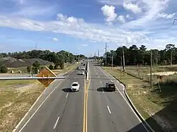 CR 549 begins at an intersection of Main Street (Route 166) and Water Street (CR 527) in Toms River, Ocean County, heading east on four-lane undivided Water Street. The road runs through the commercial downtown of Toms River a short distance to the north of the Toms River. The route turns north onto Hooper Avenue, which passes through more of the downtown area before heading into residential areas and narrowing to two lanes. Upon crossing the intersection of Route 37, CR 549 becomes a six-lane divided highway with jughandles that passes through commercial areas, narrowing to four lanes. The road heads to the west of the Seacourt Pavilion shopping center and intersects with Bay Avenue (CR 571) at an at-grade cloverleaf interchange. Following this, the roadway passes to the west of the Ocean County Mall, widening to six lanes again. The road narrows back to four lanes at the intersection of Oak Avenue (CR 94) as it passes more shopping centers, turning more to the northeast. CR 549 enters wooded areas as it passes an entrance to Ocean County College and comes to an intersection of Fischer Boulevard (CR 549 Spur). Past this intersection, the route makes a turn to the north again and enters more commercial areas, crossing the intersection of Church Road (CR 620) before entering Brick Township. Here, CR 549 becomes Brick Boulevard and intersects with Hooper Avenue (CR 631) before continuing past more development with three northbound lanes and two southbound lanes. After the intersection of Beaverson Boulevard (CR 66), the road carries two lanes in each direction as it reaches the intersections of Drum Point Road (CR 624) and Cedar Bridge Avenue (CR 528), turning more to the northeast. CR 549 comes to an intersection with Brick Boulevard (CR 631), at which point CR 549 splits from Brick Boulevard by heading northwest on Chambers Bridge Road while CR 631 continues north on Brick Boulevard. The four-lane undivided road passes shopping centers and crosses the intersection of Route 70. After this intersection, CR 549 widens into a four-lane divided highway again and passes more businesses, turning into an undivided road again as it comes to a partial interchange with the Garden State Parkway that has access to the southbound direction of the parkway and from the northbound direction of the parkway.[1][2]