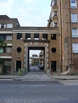 178 flats were built by the London County Council, on the east side of St Leonard's Road, opening in 1935.[2] As well as the main block called Coventry Cross, there were three smaller blocks, Fuller, Philips and Tennant Houses. Flats in these smaller blocks originally did not have individual bathrooms, but each three flats shared one, along with an area for washing clothes.[3]
