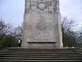 The north elevation has a tall stone cross sculpted in relief, above a sculpted wreath and the dates of the two World Wars, "1914-1918" and "1939-1945", a relief sculpture depicting the arms of the city of Coventry, and a shelf for floral tributes. The south elevation also has a tall cross sculpted in relief and a shelf for tributes. The platform bears bronze discs commemorating men of Coventry awarded the Victoria Cross, including Charles Parker (Boer War), and Arthur Hutt, Henry Tandy, William Beesley, and Alfred Edward Sephton (all First World War). A separate bronze plaque bears a quotation from Laurence Binyon's poem "For the Fallen".