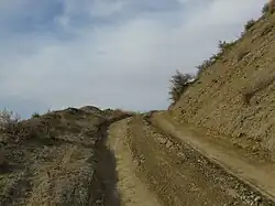 As for the old freight trail that went upstream from the mouth of Cow Creek, there is no longer any road to speak of in the first 15 miles. The multiple creek crossings of the old Cow Creek trail have been eroded away into cut banks, and the gravel bars where the wagons crossed have been swept down stream. Here and there the remnants of the old Cow Creek Trail can be observed along Cow Creek but it is sketchy.[9] Upper Cow Creek is not so isolated. About 15 miles up from the Missouri, where Davidson Coulee flows into Cow Creek, Blaine County Road 330 (Cow Creek Trail) drops down Davidson ridge to Cow Creek Bottom from the west. One ranch is located near this point. The name "Cow Island Trail" is still applied to the road that goes from the junction of Cow Creek and Davidson Coulee up to the bench and on to the west, and this is probably the same route that the original Cow Island freight trail followed as it went on to Ft. Benton. Above Davidson Coulee Cow Creek is paralleled by Blain County Road 314 (Birdtail Road) for about 6 miles (10 km). In the upper reaches of Cow Creek a County road (Birdtail Road) descends to a second ranch. Blaine County Road 300 crosses Cow Creek at it upper end, near the forks of West and East Cow Creek, just under the southern flank of the Bears Paw Mountains.[10]