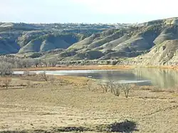 Just upstream from the mouth of Cow Creek, the Kipp homestead lies in Cow Creek bottom. It is adjacent to the site of the old upper steamboat landing, above the mouth of Cow Creek. One source reports that the Kipp homestead was originally filed by the historic figure James Kipp (1788–1880) and was lived in by his son, Joseph and then his grandson, James Kipp, but that this Kipp homestead and the homestead downriver on Bull Creek became the property of the Jones family, related by marriage to the Kipp family.[6] Another source indicates the homestead was claimed by Jim Kipp in 1913. Jim was the son of Joseph Kipp (1849–1913) who was the son of the historic figure James Kipp (1788–1880) and his wife Earth Woman.[7]
