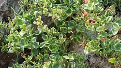 The evergreen leaves may or may not have a petiole, up to 15 mm long, with a blade that varies from elliptic to ovate (usually ovate under the inflorescence and elliptic towards the base of the branches), acute or acuminate, more or less sharply tapering towards the petiole, with an entire or serrate margin, with the margin flattened in the dorsiventral direction, green or yellowish-green, often with a red edge.[4] A variegated variety features green and cream striped leaves.