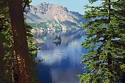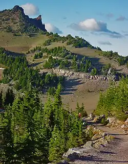 The Watchman Peak trail begins from the Watchman Overlook parking lot, about 3.8 mi (6.1 km) northwest of Rim Village.[22] The trail is 0.8 mi (1.3 km) long with a 420-foot (130 m) elevation change.[23] It is a steady uphill trail on an isolated mountain on the west rim of the crater, with several switchbacks, providing wide views of Crater Lake and Wizard Island. Several nearby landmarks are visible from the summit, including Mount McLoughlin, Mount Thielsen, Union Peak, Mount Scott, and the Klamath Basin. The trail ends next to a historic fire lookout tower built in 1932.[22]