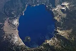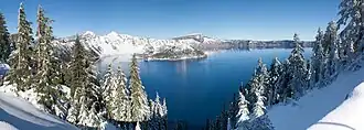 180-degree panoramic photograph of Crater Lake from the top of nearby Mount Scott, looking west. Two snow-covered peaks can be seen in the distance: to the right of the lake is Mount Thielsen, and in the far left of the photo is Mount McLoughlin.
