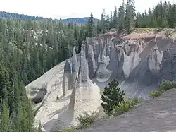 • The Pinnacles: When the very hot ash and pumice came to rest near the volcano, it formed 200-to-300-foot-thick (60 to 90 m) gas-charged deposits. For years afterward, hot gas moved to the surface and slowly cemented ash and pumice together in channels and escaped through fumaroles. Erosion later removed most of the surrounding loose ash and pumice, leaving tall pinnacles and spires.