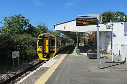 The station originally had two platforms with a passing loop; this was taken out of use when the signal box closed on 16 October 1977, though the redundant track remained in place for several years. The station is now a single-platform, unstaffed halt.[8][9] The platform is accessible from the High Street, and there is a car park.[10] The main station building is in private use.[11]