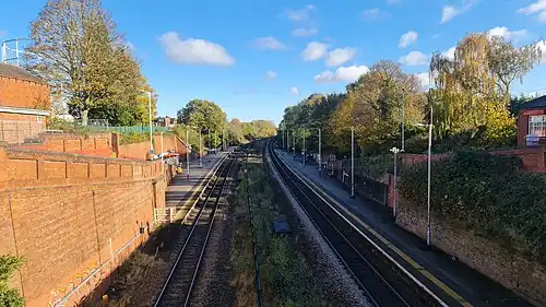 Goods traffic ceased here in June 1964 and the fast lines were removed by the end of the decade. The platform canopies and buildings were demolished in stages in the 1970s, leaving only basic shelters in place. The old lattice footbridge linking the platforms was also demolished in 2007 after being disused and blocked off for several years.[2]