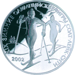 A Russian commemorative coin depicting Cross-country skiing at the 2002 Winter Olympics.