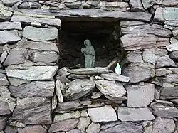 On the summit of Cruach Mhór is a stone grotto built by a local farmer who hauled up the cement on his back, and its small statue is changed every year. The square structure, which sits on the exact summit, is visible from a distance.[6]