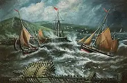 The sea around Ceredigion has traditionally been rich in fish and for many centuries great shoals of herring would be caught in Cardigan Bay. The fish would be landed and sold at all the Ceredigion ports, including Aberaeron, Aberporth and Aberystwyth.[7][8] At Aberystwyth the volume of herring landed increased significantly after the harbour was enlarged during the eighteenth century. Here, the fish were salted between September and November and then packed in barrels for transport by train to England.[9] Herring was also an important food source for local people and the fish were salted in the autumn for winter use.[10]