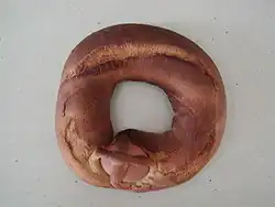 Several cakes are prepared for feasts and special occasions, and some are characteristic of one town or village: Strenna (a pie made with flour and sdruttu dough and a brocciu filling) is prepared in Vico for New Year's Day, panzarotti (beignets made with flour, rice and yeast) are prepared in Bastia for Saint Joseph's Day (19 March),[90] panette for All Saints' Day (1 November), pan di i morti (also named uga siccati, small breads made with flour, yeast, sugar, butter, eggs, raisins and walnuts) for All Souls' Day (2 November) in Bonifacio,[91] canestri (donuts made with flour, butter, eggs and sugar) [92] and campanili (donuts made with flour, yeast, egg, shortening, raisins soaked in aquavita and sugar, decorated with boiled eggs) [92] at Easter, sciacci (the sweet version of these fritters, stuffed with brocciu, and traditionally cooked on a hot granite stone named teghja) are prepared in Sartène at Easter and during sheep shearing, in May.[93] Inuliata, prepared in Ajaccio during the Holy Week, is a yeast cake having flour, powdered sugar, olive oil and wine as ingredients.[86] Fritelli, eaten at Maundy Thursday in Calenzana,[13] are wheat or chestnut flour fritters.[94]