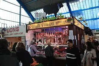 Meat and game can be bought at a number of local butchers' shops. Paul Tucker and Son trade at Penclawdd, selling locally sourced beef, lamb (including Llanrhidian salt marsh lamb), poultry, and pork, and their own bacon, faggots, and award-winning beef and lamb burgers. Howells is another Penclawdd butcher, and supplies salt marsh lamb from the marshes at Llanrhidian.[4] Weobly Castle Farm sells Gower salt-marsh lamb.[5] In Swansea, Gower butcher Hugh Philips and his family have had a stall at Swansea Market since 1878, when his grandfather started the business. Meat is sourced from the family farm in Gower and neighbouring farms. They specialise in Welsh lamb, seasonal salt-marsh lamb, and traditional beef breeds, such as the Welsh Black. They also make home-made sausages.[10]