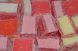 Hamburger Speck is a sort of candy made out of foamed sugar with various coatings. The color is often reminiscent of the colors of Hamburg, red-white-red. The name refers to the similarity with bacon (or speck).[7]