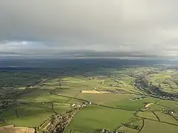 Aerial view of the Vale of Glamorgan looking north towards Llancarfan, showing fields, river valleys and the uplands of the Blaenau Morgannwg in the distance