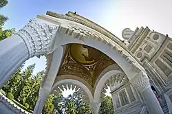 The building resembles a very large and elaborate mausoleum, and was built in the Byzantine architectural style, with arabesques. The cathedral sits upon a raised platform, 7 ft (2.1 m) above the surrounding grade, and encircled by a stone balustrade. In shape the structure is oblong, with a many-sided annex at the back. A dome rises in the center, fronted by two smaller twisting and leaning cupolas, while a secondary dome, broader and loftier than the central one, springs from the annex. Each summit is crowned by an inverted pear-shaped stone, bearing a triple cross, emblematic of the Trinity.[3]