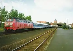 Cuxhaven (German: Bahnhof Cuxhaven) is a railway station located in Cuxhaven, Germany. The station is located on the Lower Elbe Railway and Bremerhaven–Cuxhaven railway. The Cuxhaven-Bremerhaven service is operated by EVB. The Cuxhaven to Hamburg service, which was operated by Deutsche Bahn, became a Metronom service at the end of 2007. In December 2018, Start Unterelbe GmbH, a subsidiary of Deutsche Bahn, took over the service.[4] Today the station building is owned by a cooperative.