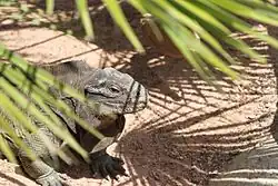 Cyclura cychlura figginsi, known by the common name of guana[4] and sometimes called the Exuma Island iguana in the international literature, is a subspecies of the northern rock iguana, C. cychlura, that is found on the Exuma island chain in the Bahamas with an estimated wild population of 1,300 animals in 2004, it has been listed on the IUCN Red List as critically endangered.[1]