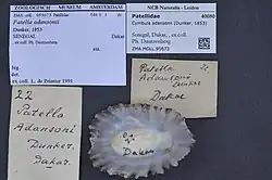Cymbula adansonii is a species of true limpet grouped under the family of Patellidae, from the marine gastropod phylum. Limpets from the Patellidae family are classified into four clades: Helcion, Cymbula, Scutellastra, and Patella. The Cymbula genus originally emerged in Southern Africa. It shares a sister relationship with the Helcion genus. Cymbula adansonii is one out of eight Cymbula subspecies.[2] The Cymbula genus originally emerged in Southern Africa. Cymbula adansonii was first discovered in 1853 by German zoologist Wilhelm Dunker. It is naturally endemic to the Atlantic Ocean, specifically on the southwestern coast of Africa.