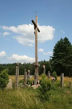 On 23 June 1944 at 4 a.m. the German military police entered the village and "pacified" it. The inhabitants were ordered to leave their homes, after which 53 people were loaded onto trucks and taken to concentration camps. The village was almost completely burnt down. Out of 43 households only five were left. In the village there is a stone with an engraved inscription commemorating the event.[6]